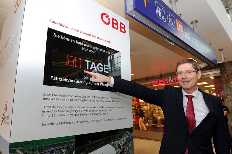 Aus diesem Anlass wurde heute ein Countdown-Ticker am Wiener Westbahnhof von Franz Seiser, Vorstand der ÖBB Holding AG, enthüllt. Auch am Bahnhof in St. Pölten wird ab heute ein Countdown-Ticker Kunden darauf hinweisen, dass in 100 Tagen eine neue Ära des Bahnfahrens beginnen wird. Ebenso wird es in Kürze auch auf den Monitor-Anzeigen in den Reisezentren der großen Bahnhöfe auf der Weststrecke sowie in den ÖBB-Lounges Countdown-Einspielungen geben.
