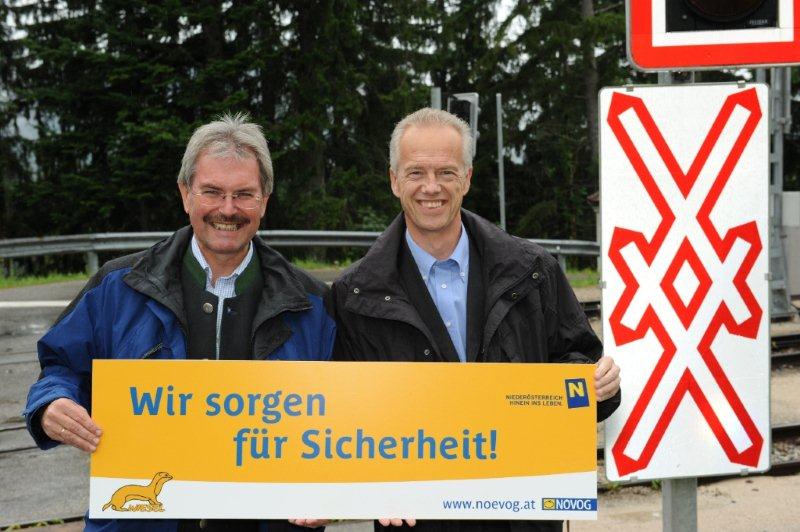 Verkehrslandesrat Karl Wilfing und NÖVOG-Geschäftsführer Gerhard Stindl auf Lokalaugenschein bei der nunmehr technisch mit Lichtzeichenanlage gesicherten Eisenbahnkreuzung Gösing.