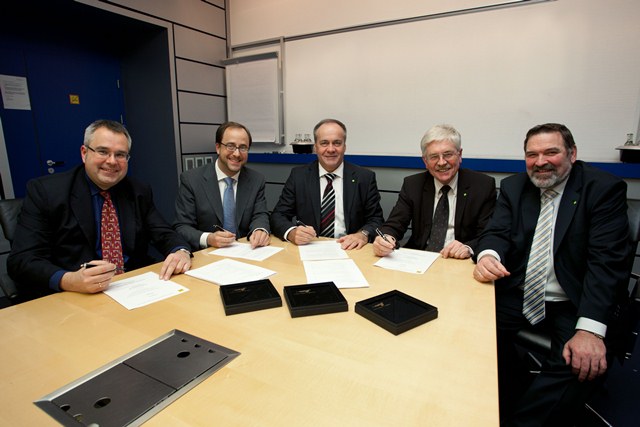 Die Tinte unter den Verträgen ist trocken. Die neuen Bahnen können kommen. Bei der Vertragsunterzeichnung (v.l.n.r.): Oliver Schmidt Vizepräsident Vertrieb und Produkte, Bombardier LRV, Germar Wacker President, Light Rail Vehicles, Bombardier Transportation, Klaus-Peter Wandelenus, Vorstand Technik, Essener Verkehrs-AG, Dr. Horst Zierold, Vorstand Finanzen, Essener Verkehrs-AG, Wolfgang Weber, Aufsichtsratsvorsitzender, Essener Verkehrs-AG - Quelle Essener Verkehrs-AGDer Rat der Stadt hatte bereits 2010 sein Okay gegeben und heute wurden die Verträge in Essen unterzeichnet: 27 neue Niederflurtrams für Essen – eine gewaltige Investition von rund 70 Millionen Euro für die Essener Verkehrs-AG. Nach einem europaweiten Ausschreibungswettbewerb ging der Zuschlag an die Fa. Bombardier Transportation.