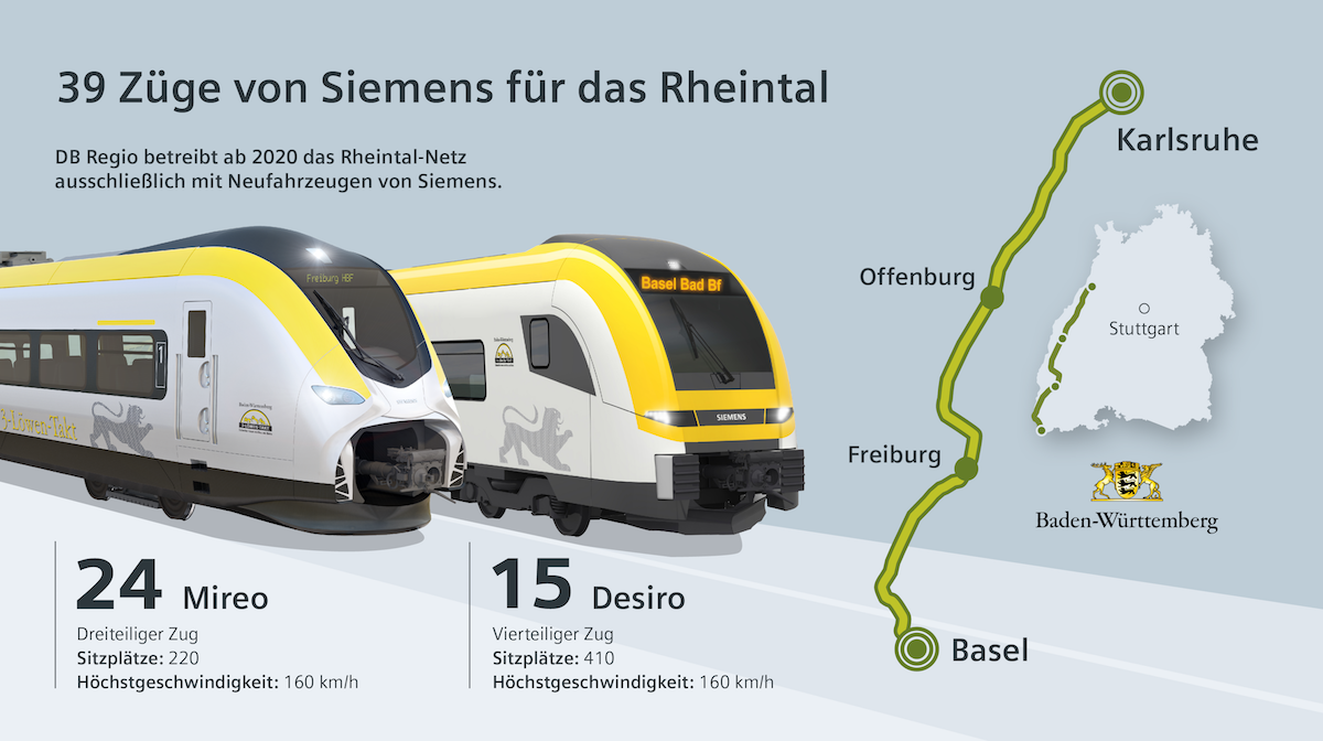 Die DB Regio AG wird ab 2020 das Rheintal-Netz im Südwesten Deutschlands ausschließlich mit Neufahrzeugen von Siemens betreiben. Die Nahverkehrssparte der Deutschen Bahn hat hierfür insgesamt 39 Regionaltriebzüge bestellt. Der Auftrag umfasst 15 Desiro-HC- und 24 Mireo-Züge. Dies ist die erste Order für Fahrzeuge aus der neuen Regionaltriebzugplattform Mireo, die erst kürzlich auf der weltgrößten Bahnmesse Innotrans vorgestellt wurde. Die 216 Fahrwerke der Züge kommen aus dem Siemens-Werk in Graz.