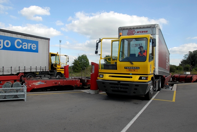 Mit einem tiefgelegten Tragwagen des Typs Modalohr UIC lassen sich Sattelauflieger mit einer Eckhöhe von 4-Meter über die nur für 3,8-Meter zugelassene Gotthardstrecke von der Strasse auf die Schiene verlagern. Wenn es nach den gemeinsamen Initianten SNCF GEODIS und MODALOHR geht, so können ab 2015 an die 100'000 zusätzliche Fahrzeuge pro Jahr umweltschonend die Schweizer Alpen durchqueren. Sie stellten am Donnerstag (24.05.2012) Medien und Meinungsbildnern das revolutionäre Konzept im Terminal von Bettembourg bei Luxemburg vor. Hier verkehren täglich acht Rollende Autobahnen von und nach Südfrankreich über eine Strecke von mehr als 1'000 Kilometer.