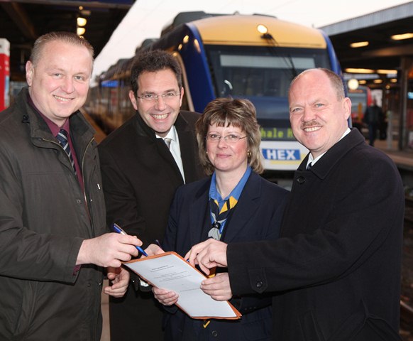 Das Land Sachsen-Anhalt setzt seine Serviceoffensive im Nahverkehr fort: Heute unterzeichnete Sachsen-Anhalts Verkehrsminister Thomas Webel gemeinsam mit Andreas Putzer von der Veolia Verkehr Sachsen-Anhalt GmbH (Harz-Elbe-Express) und Nasa-Geschäftsführer Klaus Rüdiger Malter die Vereinbarung, mit der das Kundenbetreuer-Projekt beim HEX bis zum Jahr 2017 fortgesetzt wird. Minister Webel sagte: "Mit den zusätzlichen Kundenbetreuern erhöhen wir die Servicequalität und die Sicherheit für die Reisenden. Außerdem verbessert sich die Fahrgastinformation durch eine Betreuung im Zug erheblich."