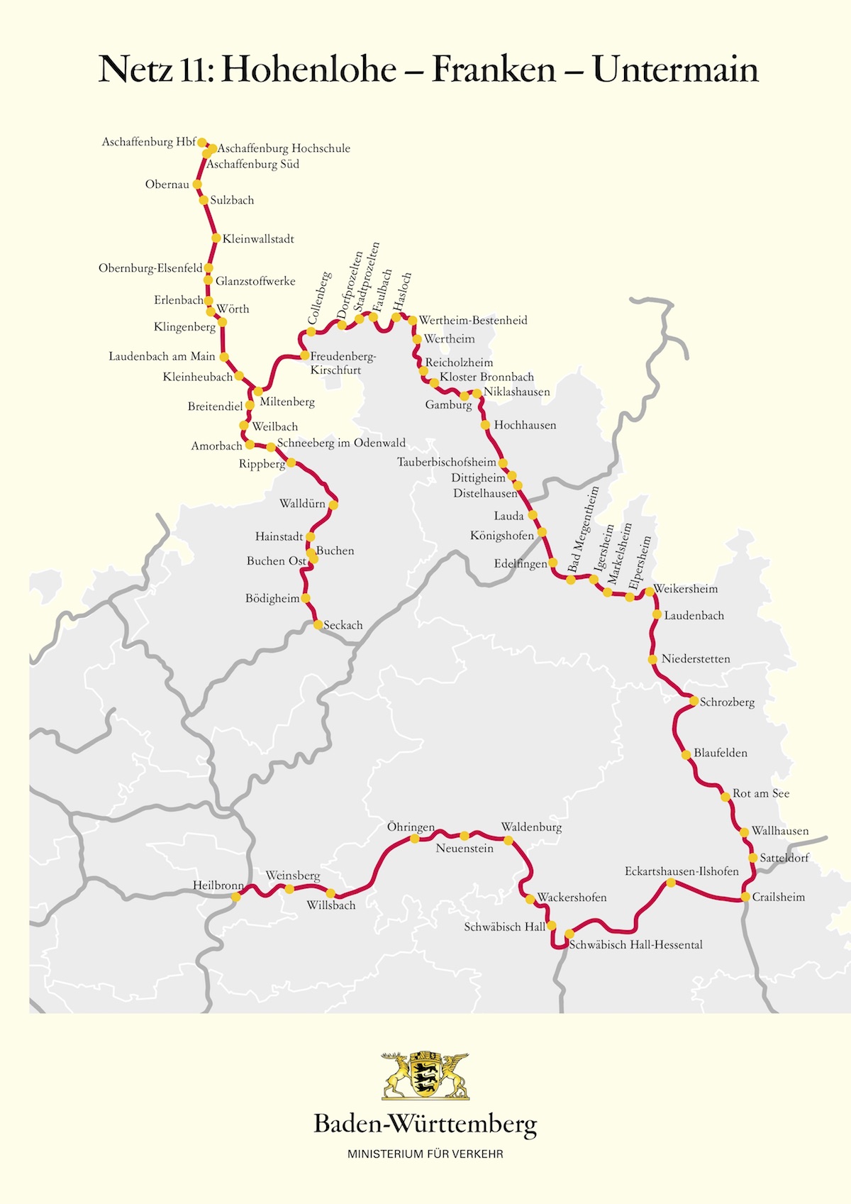 - Aschaffenburg Hbf – Miltenberg – Wertheim – Lauda – Crailsheim
