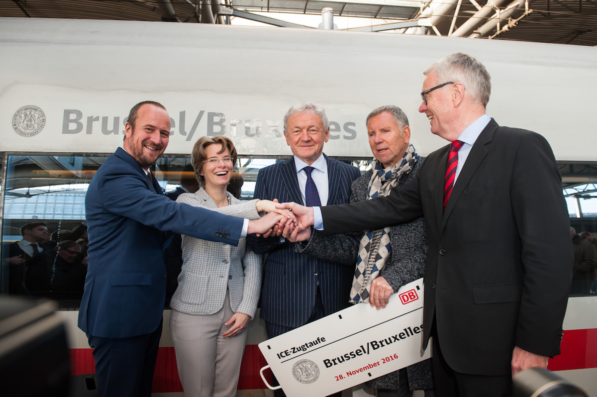 Das ICE-Angebot zwischen Frankfurt/Main und Brüssel wird zum Fahrplanwechsel am 11. Dezember ausgeweitet. Aus diesem Anlass wurde heute im Bahnhof Brüssel-Süd (Bruxelles-Midi/Brussel-Zuid) ein ICE der Deutschen Bahn (DB) auf den Namen der belgischen Hauptstadt getauft. Die Namensgebung nahmen Birgit Bohle, Vorstandsvorsitzende der DB Fernverkehr AG, Bart De Groote, Vorstand Marketing und Verkauf der belgischen Staatsbahn SNCB/NMBS, und Alain Courtois, Erster Schöffe der Stadt Brüssel und Vertreter des Bürgermeisters, vor.