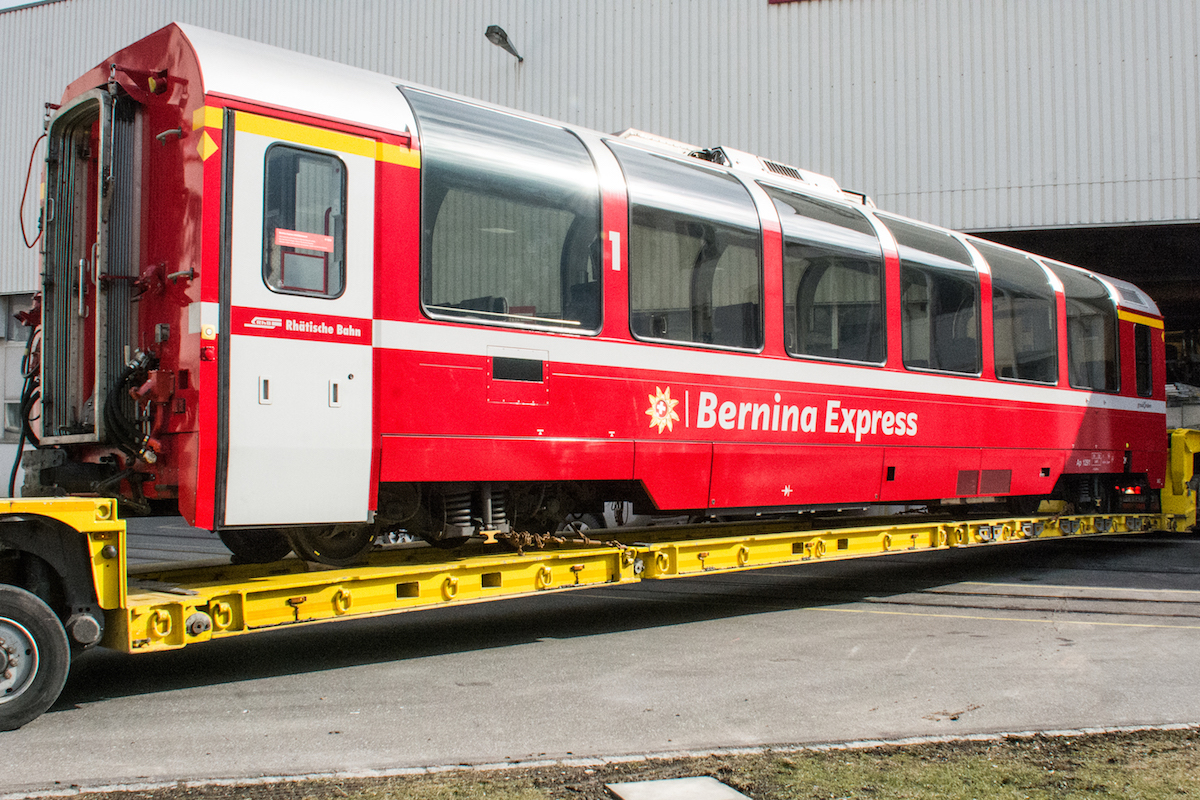 Das gab es noch nie: Erstmals überhaupt wird morgen Donnerstag ein Bernina Express Wagen der Rhätischen Bahn (RhB) am Bahnhof Zürich zu sehen sein. Heute Mittwochnachmittag wurde der Wagen in Landquart verladen, um den Weg nach Zürich in Angriff zu nehmen. Neben dem Schienenfahrzeug wird auch der neue Bernina Express Bus in Zürich präsentiert.