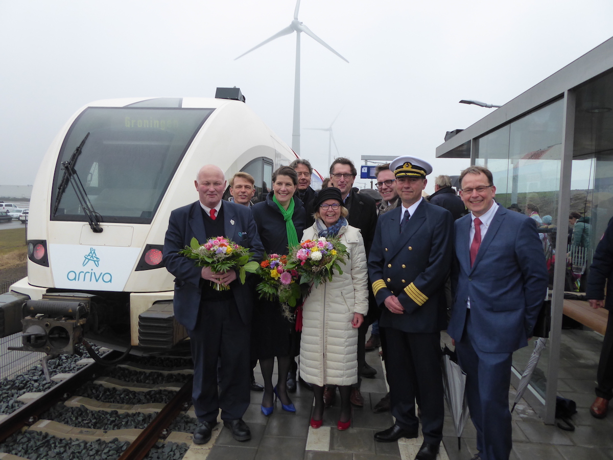 Um dem historischen Moment gerecht zu werden, wurde ein Zug mit Abbildungen von Groningen, Eemshaven und Borkum beklebt. Der ankommenden erste Zug in der nördlichsten niederländischen Station wurde mit einem festlichen Programm in Deutsch-Niederländischer Atmosphäre begrüsst. Gleich als sich die Türen öffneten, erklang Musik vom Borkumer-Musiker Albertus Akkermann, der die Kindertrachtengruppe “Dansmuskes” bei ihrem Auftritt begleitete. Weiterhin hat es sich Kapitän Dirk Saathoff von MS “Münsterland” nicht nehmen lassen, dem Arriva-Lokführer einen Blumenstrauß zu überreichen. Mit Musik ging es dann fußläufig ca. 200 Meter in das Bokumlijn-Terminal, hier schnitten die Projekt-Verantwortlichen gemeinsam eine große Torte mit der Abbildung des Zuges Groningen-Borkum an.