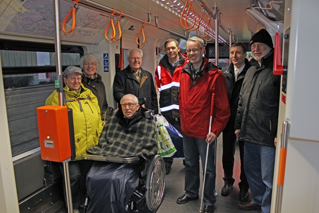 Sind die Einrichtungen des Vamos in Blindenschrift erklärt? Können Rollstuhlfahrer die Haltewunschtaster gut bedienen? Mitglieder des Beirates für Behindertenfragen der Stadt Bielefeld haben sich kürzlich den neuen Stadtbahn-Wagen Vamos ganz genau angeschaut. Ihr Fazit: Das Fahrzeug überzeugt – mit kleinen Nachbesserungen.