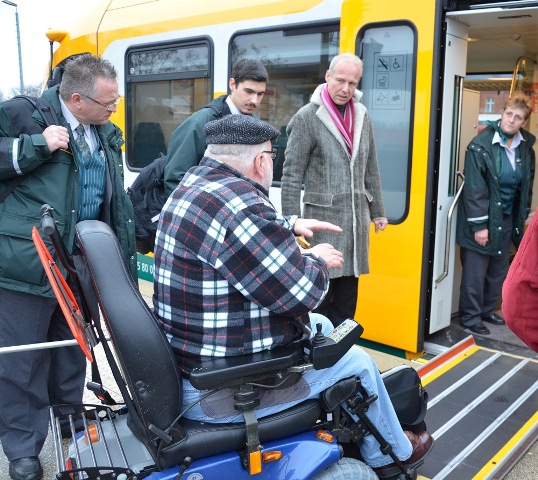 In diesem Rahmen hat am 16. Januar eine Vor-Ort-Besichtigung stattgefunden. Auf einer regulären Fahrt auf der neu von der ODEG bedienten Linie OE51 zwischen Brandenburg an der Havel und Rathenow haben die Teilnehmer sowohl einen ODEG-Triebwagen vom Typ GTW als auch den Betriebsablauf nach den Gesichtspunkten der Barrierefreiheit angeschaut.