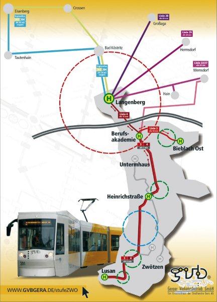 Die zweite Stufe des Stadtbahnprogramms des Geraer Verkehrsbetriebes (GVB) wird in vollem Umfang umgesetzt. Das erklärten Oberbürgermeisterin Dr. Viola Hahn und GVB-Geschäftsführer Ralf Thalmann nach Abschluss der letzten Wirtschaftlichkeitsberechnungen. Wie der GVB-Geschäftsführer heute (3. September) schilderte, habe eine Untersuchung einer unabhängigen Wirtschaftsprüfungsgesellschaft bestätigt, dass von der Umsetzung des Stadtbahnprogramms positive Effekte sowohl für die Stadt als auch für die Wirtschaftlichkeit des GVB ausgehen. Auch gehe aus der Analyse hervor, dass diese Effekte nur bei einer Umsetzung aller vorgesehenen Teilprojekte zu erzielen seien.