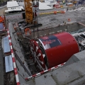 Unter den Augen von zahlreichen interessierten Beobachtern montierte das Bauteam eines der wichtigsten Teile an der Tunnelbohrmaschine: den 234 Tonnen schweren Bohrkopf. Ein Raupenkran hievte das Teil mit einem Durchmesser von 12.75 Meter an, hob es in die Baugrube vor dem künftigen Tunnelportal, wo es fachgerecht am Schild der Tunnelbohrmaschine montiert wurde.