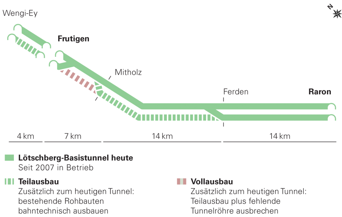 Der NEAT Lötschberg-Basistunnel wurde aus finanzpolitischen Überlegungen in einer ersten Etappe nur reduziert gebaut und 2007 in Betrieb genommen. Von den rund 35 Tunnelkilometern sind heute 21 Kilometer im Abschnitt Ferden-Frutigen nur einspurig befahrbar. Auf 14 Kilometern zwischen Ferden und Mitholz besteht eine zweite Tunnelröhre im Rohbau ohne bahntechnische Ausrüstung, die restlichen 7 Kilometer sind noch nicht ausgebrochen. Diese lange einspurige Strecke führt zu hohen Betriebskosten, engt den Spielraum für die Fahrplangestaltung ein und verunmöglicht eine Ausweitung der bereits heute ausgereizten Kapazität für Personen- und Güterzüge.