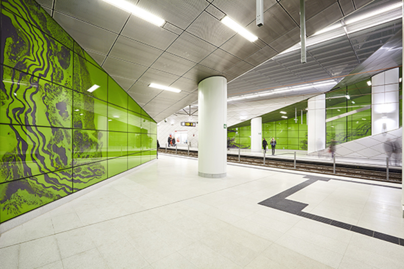 1.000 m2 farbig gestalteter Glastafeln geschaffen hat. Leuchtend grün, durchbrochen von einem pulsierenden Linienschwung in Violett, lässt er einen begehbaren Farbraum entstehen. An jedem der drei Zugänge beginnt ein solcher Farbstrom. Jeweils an der außenseitig liegenden Treppenwand liegend, umfasst der Achat auf diese Weise den gesamten Bahnhof und entfaltet von der Straße, über die Zwischenebene, bis auf den Fahrsteig seine Wirkung. Als ruhiger Gegenpol steht den dynamisch gestalteten Wandtafeln mit all ihren Schattierungen und Verwerfungen eine monochrome Farbfläche im gleichen Grünton gegenüber, die ebenso Teil des Gesamtkunstwerkes darstellt.