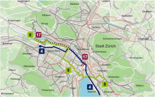 Die Tramlinie 17, die im Zusammenhang mit dem Tram Zürich-West eingeführt wird und von Zürich HB bis Werdhölzli fährt, wird voraussichtlich mit der Verlängerung der Linie 8 im 2016 eingestellt.