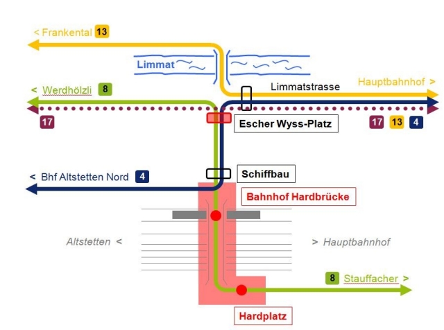 Die Tramlinie 4 wird ab Dezember 2011 vom Escher-Wyss-Platz unter der Hardbrücke durchgeführt und fährt dann über die Pfingstweidstrasse bis zum Bahnhof Altstetten.