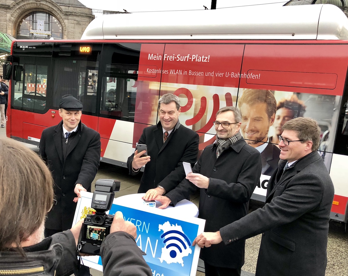 „Mit dem BayernWLAN erhält jede Stadt und jede Gemeinde die Möglichkeit, Bürgern und Touristen an ihren attraktiven Plätzen die digitale Welt zu erschließen. Mit unserer Initiative für freies WLAN wollen wir für digitale Chancengleichheit und gleichwertige Lebensbedingungen in ganz Bayern, in Stadt und Land, sorgen“, so Staatsminister Dr. Markus Söder. Der VAG-Vorstandsvorsitzende Josef Hasler dankte mit folgen-den Worten: „Wir begrüßen die Initiative des Staatsministeri-ums. Sie ist wichtig, da viele öffentliche Einrichtungen, aber auch Unternehmen wie die VAG den Aufbau eines WLAN-Netzes nicht alleine stemmen können. Umso mehr freut es uns, dass die Förderung durch das Staatsministerium nun heute verdoppelt und von 400.000 auf 800.000 Euro erhöht wurde. Das erweitert unsere Möglichkeiten enorm, so kön-nen weitere U-Bahnhöfe und Züge ausgestattet werden.“