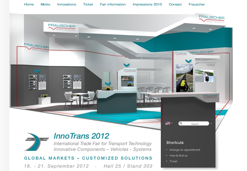 „Global markets, customized solutions" – unter diesem Motto wird Frauscher auf der InnoTrans in Berlin vom 18.-21. September 2012 den State of the Art im Bereich Raddetektions- und Achszählsysteme präsentieren. Dem hohen Innovationsanspruch und der steigenden Kundennachfrage entsprechend werden die jüngsten Eigenentwicklungen und aussagekräftige Praxisbeispiele diesmal noch moderner, großzügiger und informativer positioniert als in den Jahren zuvor.