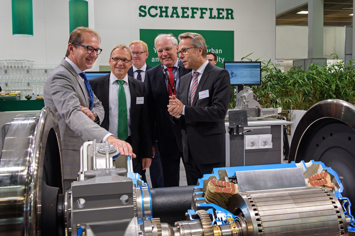 Auf der InnoTrans 2016, weltweite Leitmesse für Bahntechnologie in Berlin, präsentiert Schaeffler sein umfassendes Know-how für die Antriebstechnik der zukünftigen Zug-Generationen und Konzepte für deren digitalisierte Überwachung und Instandhaltung. Einen Überblick über die Schaeffler-Innovationen für die Bahntechnik verschaffte sich auch Alexander Dobrindt, Bundesminister für Verkehr und digitale Infrastuktur, während seines Eröffnungsrundgangs. Auf dem Stand von Schaeffler erläuterten Dr. Stefan Spindler, Vorstand Industrie der Schaeffler AG, und Dr. Michael Holzapfel, Leiter Geschäftsbereich Rail Europa bei Schaeffler, die neuen Produkte und Dienstleistungen von Schaeffler.