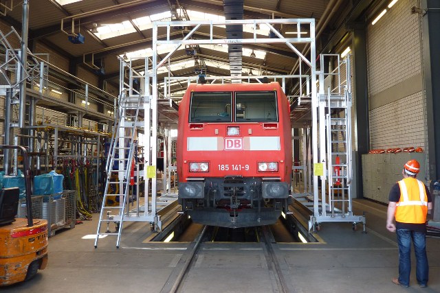 Wenn Zugmaschinen oder große Doppelstockwagen früher zur Wartung oder Reinigung ins Depot fuhren, waren sie für eine ganze Weile „außer Dienst". Für den Auf- und Abstieg an Front und Seiten wurden Leitern oder Rollgerüste genutzt und ständig umgesetzt. Sonderkonstruktionen sparen heute viel Arbeitszeit: Moderne Hubarbeitsbühnen können sogar am Zug entlang verfahren werden. Auch in der Höhen- und Seitenausrichtung sind sie trotz ihrer großen Dimensionen millimetergenau einstellbar. Ein Spezialist für solche individuellen Konstruktionen ist die Firma euroline (Bad Pyrmont). Die Steigtechnik-Experten entwickelten zudem eine neue elektrische Steuerung, mit der die Arbeit noch komfortabler, schneller und sicherer wird.
