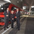 Die Erweiterung der Railjet Flotte von 51 auf 60 Garnituren ist abgeschlossen: Die 60. Garnitur wurde heute von Siemens Generaldirektor Wolfgang Hesoun an den ÖBB Vorstandsvorsitzenden Andreas Matthä übergeben. Für die Reisenden bringen die neuen Züge – die auf der Weststrecke zwischen Wien und Salzburg bis 11. Dezember schrittweise die Intercity-Garnituren ablösen – deutliche Vorteile: Sie profitieren vom höheren Fahrkomfort, inklusive kostenlosem Railnet, dem neuen onboard Portal mit WLAN, Service und Infotainment, von besserer Information über die Fahrgastinfo-Monitore, kulinarischer Verpflegung im Bordrestaurant und von einem Kinderkino für die jüngsten Fahrgäste. Insgesamt haben die ÖBB 145 Millionen Euro in die neuen Garnituren, die von Siemens Österreich gebaut wurden, investiert. Mit dieser Anschaffung haben die ÖBB in den vergangenen zehn Jahren mehr als zwei Milliarden Euro in die Modernisierung des Fuhrparks und damit in mehr Komfort für die Fahrgäste investiert.